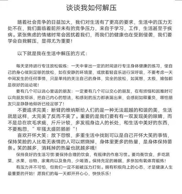 压力在生活中无处不在,它可能来源于学习,来源于人际交往,来源于竞争……压力对生活的影响很大,不仅仅是情绪,时间一长,连身体的健康都会受到连累。本次活动以“爱滨院•谈心路•互分享•爱生活”为主题,通过书信的方式谈谈自己的解压故事,旨在为有压力的同学提供一个交流平台,激发同学们对生活的热爱。活动经过学生会的宣传后,同学们积极的报名参加,完成的作品以电子版的形式上交。活动征集到不少作品,作品内容均突出秋日主题,并与校园特色相联系,内容丰富,感情细腻。经过评委的认真评选,共评出一等奖50名,二等奖80名,三等奖140名。活动最后,我们给予优胜同学相应的奖励。
