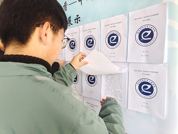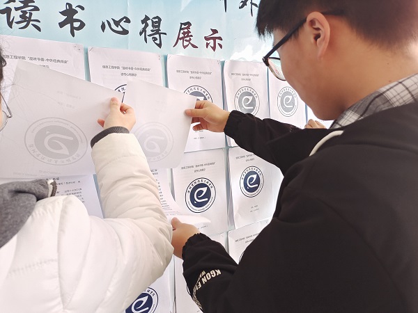 此次“品味书读书香—中外经典阅读”读书心得优秀作品的宣传栏安置在滨州学院信息楼进行公开展览。以蓝天色为背景的宣传展板上,每一本优秀的读书心得都是以向上翻页的形式整齐的排列着。这种展览形式不仅为同学们提供了阅读的便利性,还考虑到同学们的阅读体验。让同学们在一种舒适,干净的环境中欣赏心得,悟出道理。与此同时,展览宣传的方式更能激励同学们的荣誉感,更有利于鼓励同学们养成读书的习惯,写读书心得的习惯。
