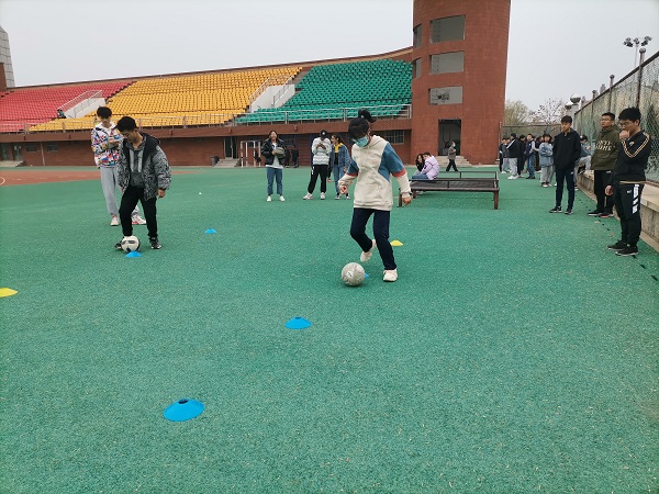 活动开始前,学生在操场指定地点集合完毕并安静等待,随后,体育部组织人员清点了到场人员的名单,并向学生介绍了此次比赛的规则,让学生熟悉比赛环境,并提前做好热身活动。此次比赛要求每人为一组,带球绕过障碍物到达指定地点,在行进过程中不得以手碰球,如有违反均视为犯规。比赛正式开始,每组选手精神都高度集中,既要注意脚下的步调,同时还要躲避障碍物,这不仅考验着学生的速度,更考验学生的应变能力。大家在欢乐中结束本次比赛。