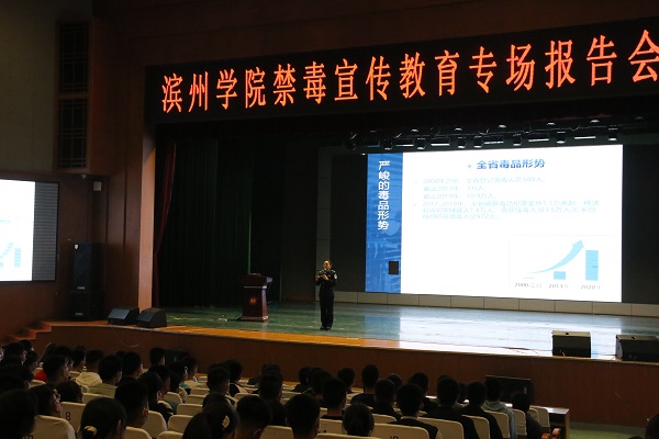 此次课堂采用现场+直播方式,由“平安英雄”滨州市公安局滨城分局禁毒大队副大队长王晓静现场讲解禁毒知识,王晓静多年从事缉毒工作,始终工作在禁毒一线,对禁毒形势了解深入,活生生的案例更是信手拈来,为同学们带来了一场精彩的禁毒知识课堂。同学们聚精会神的听,用热烈的掌声来回馈“平安英雄”王晓静带来的禁毒知识。