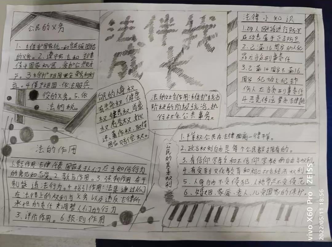 经过此次“法律就是秩序”手抄报比赛,我们学生的法律意识,尤其是法律边界问题有了明显的提高。增强了同学们遵纪守法意识,弘扬了法治精神,加强了思想道德建设。“法者,国家所以布大信于天下”,让我们一起学法,知法,懂法,用法。