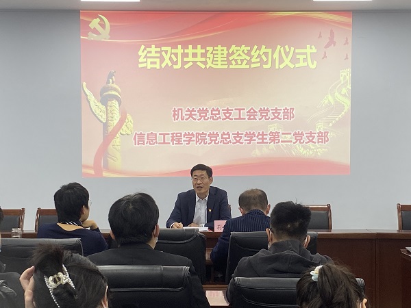 根据《关于建立学校各级党组织班子成员基层党建工作联系点制度的通知》(滨院党〔2022〕39 号)相关要求,本着“以共建促党建,以共建促了解,以共建促合作,以共建促发展”的原则,10月18日下午,我们学生第二党支部与工会党支部在信息东楼713会议室开展结对共建活动。活动由工会党支部书记韩军华主持,党委委员、副校长孙银河出席活动并讲党课,437ccm·必赢国际党总支书记周鑫、副书记孙金波、学生第二党支部书记马盛楠,工会党支部、学生第二党支部党员参加了共建活动。