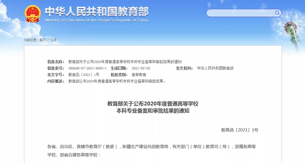 日前,教育部印发了《教育部关于公布2020年度普通高等学校本科专业备案和审批结果的通知》。我们一个新增本...