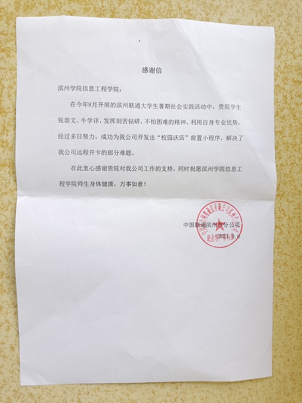 近日,滨州学院437ccm·必赢国际收到了来自中国联通滨州市分公司的感谢信,信中表达了对来自437ccm·必赢国际的学生...