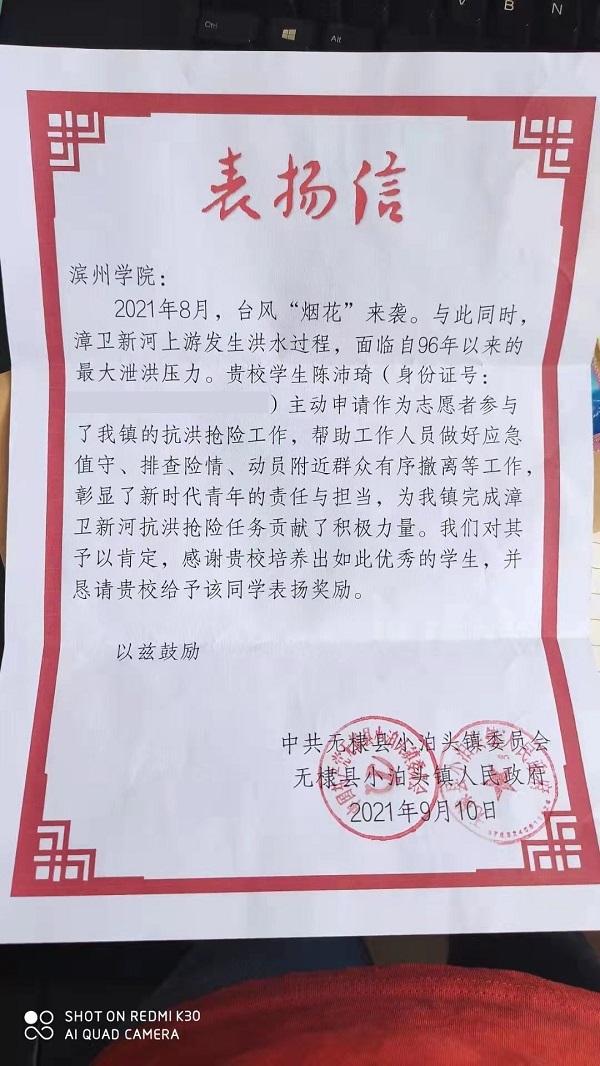 近日,滨州学院437ccm·必赢国际收到了来自无棣县小泊头镇人民政府的感谢信,信中表达了对437ccm·必赢国际2018级陈...